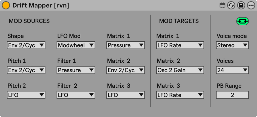 As the name already suggests, this free Max for Live audio effect allows the mapping of parameters in Drift that aren’t natively mappable within Drift itself. These parameters include modulation sources and targets, as well as a few other parameters, which through Drift Mapper become MIDI or key mappable as well. It needs to sit to the right of a Drift instance to work.